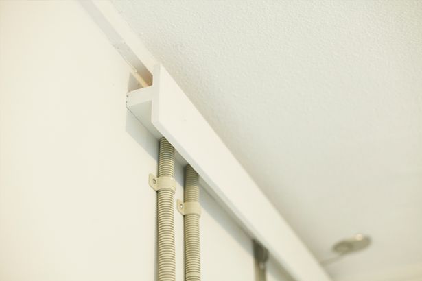 - UR団地の多くは、壁に配線が出てきてしまうのですが、いろんな配線が出ているものをすっきりみせるために、木製配線カバーをつくって整理しました。
