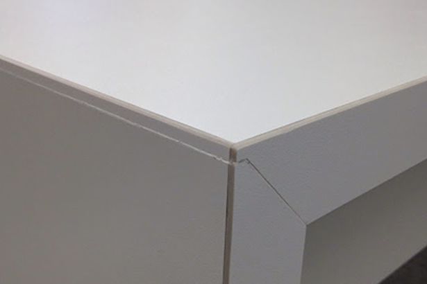 キッチンの角も薄く見せる工夫をしています。L字に分けるのではなく、斜めに切ることでデザイン的にすっきりさせています。様々な検証を経てこれらを可能にしています。