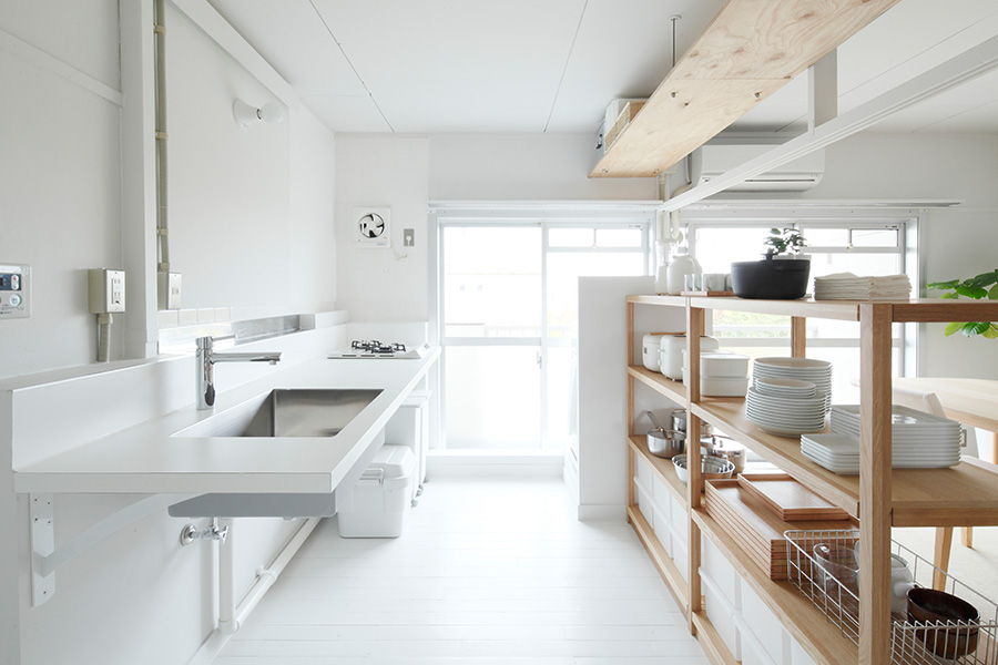 下に収納がないキッチンで、シンク・コンロ部分と、テーブル・スツールに分かれています。もし収納が必要なら無印良品の店舗に行って買っていただく、というかたちになっています。テーブルもキッチンと同じ高さで設計しています。一般的なテーブルはもう少し低いのですが、あえて高さを合わせて、様々な組み合わせ方ができるように設計しました。お客様にあった組み合わせを考えられます。