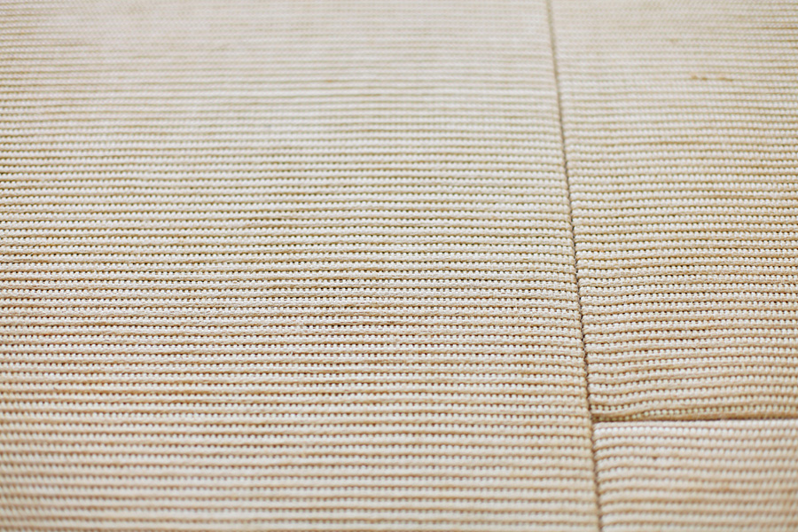 検討案として、様々なものを畳に巻いてみました。デニム、合皮等。しかし畳をデニムにするのは厳しいかなと。建築として使うのは辛いかなと。また、座っただけで色落ちしそうだったので却下になりました。 合成皮革も汚れがつきにくく経年変化しないので良いかと思いましたが、最後まで残ったのが麻でした。