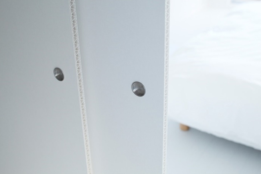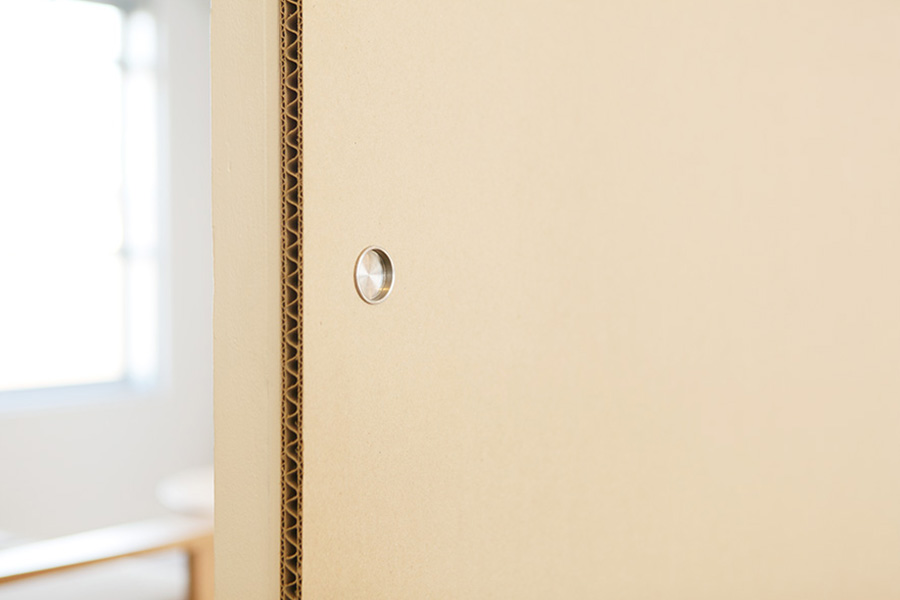 実は開発には一苦労ありまして。実施してすぐの頃、1年経つと側面が反り返ってしまうという問題が発生しました。ダンボールは水分を吸いやすいため、日々の暮らしのなかで面する2室の湿度が異なると、反ってしまうことがわかり、即改良。写真は、旧タイプのものです。湿度の異なる2室をつくって、何度も実験をしました。結果、段ボールの素材感を殺さないコーティング方法に辿り着きました。さらに、強度も調整。最終的にはアルミフレームで囲むことで、URさんの規定に適したダンボール襖を開発することができました。