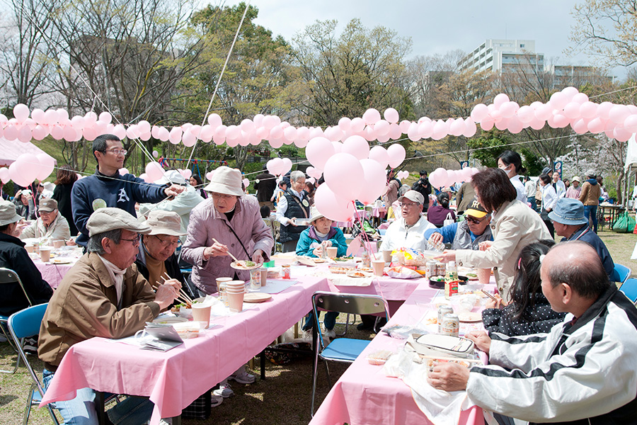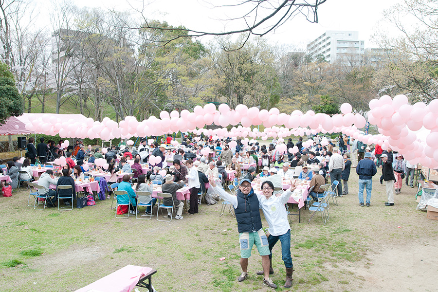 - 続いて、千里青山台団地で開催された「住人祭」。自治会さん主体で、無印良品さんとURも少しサポートをしながら、桜の開花時期にピンクの風船をあしらって、一足早い春の訪れを感じるようなイベントとなりました。
