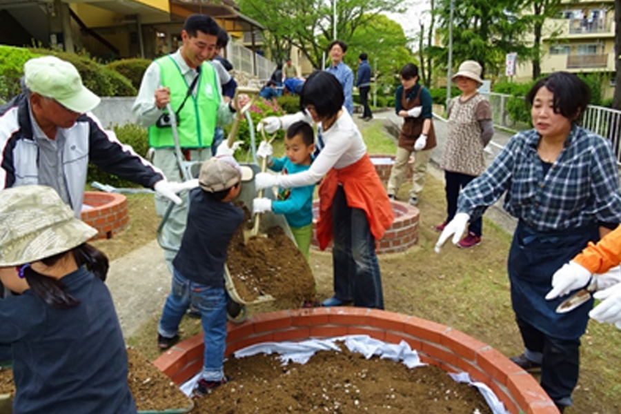 - また、「伊東豊雄 × UR みんなの庭 in 青山台」という企画も開催。団地の屋外をみんなで使えたらいいねという声から、建築家の伊東豊雄さんとURがコラボして企画。住人さんと共に小さな庭をつくり、その後は自主運営していくような仕組みができればと、現在取り組んでいるところです。丸いレンガの花壇をつくって、ハーブの収穫などを楽しみました。