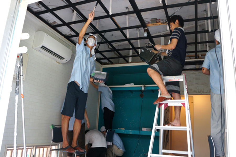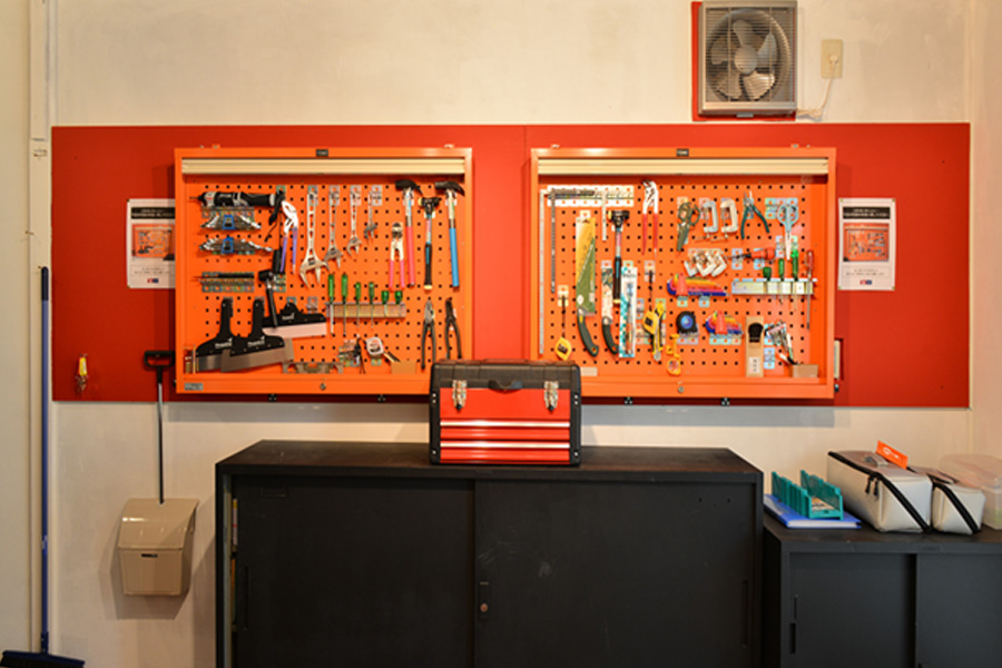 - 続いて、箕面粟生第三団地。あまり使用率の高くない集会所に工具を常設して、DIY工房をつくりました。せっかくつくるならDIY工房そのものも自分たちでつくろうと、URの若い衆が集まって、工房づくりを行いました。