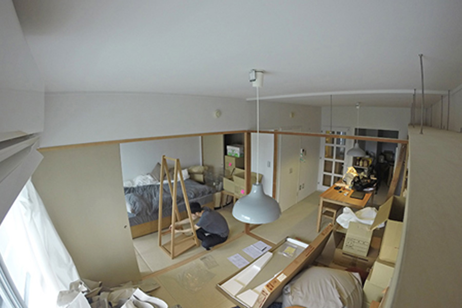 実家から持ってきた荷物は洋服と本400冊くらい。家具や家財はモニターということで、ほぼ無印良品の家具で揃えました。引っ越し当初は家具の段ボールが部屋にいっぱいに。この引っ越し自体には2日くらいかかりました。