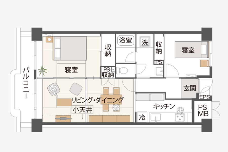 - こちらが間取り図です。いわゆる「2LDK」、すなわち寝室として使える居室が2室とリビング・ダイニング・キッチンが揃っているプランです。