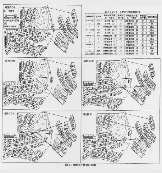 これは今は亡き、同潤会代官山アパートです。今は代官山アドレスになっていますね。昭和30年のところの、線で結んである住戸は、親戚関係があることを示しています。