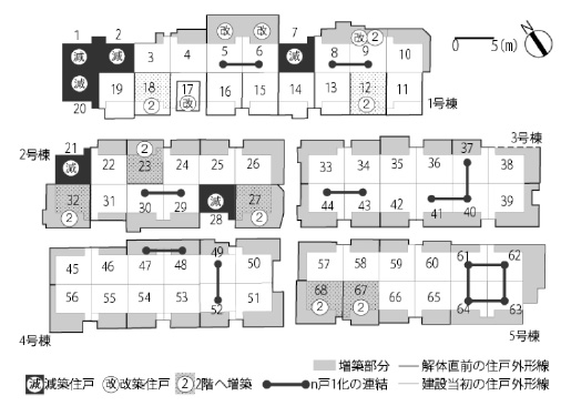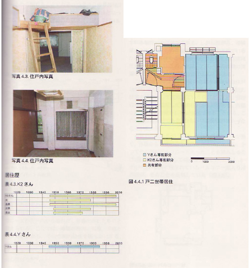次に、有名な同潤会青山アパートなんですけれども、あんまり増築はしていません。逆に、1つの住宅を2つの家族で使っていたという事例です。現代のシェアハウスのような住み方です。なぜシェアハウスが出てきたのかというと、戦後の住宅難の中で、青山アパートは、もともと都の職員の社宅として使われたんですね。そのときに、全く他人なんだけど、住宅難だからといって、もともと一つの住戸であったものを、部屋を仕切って、2家族で使っていたんです。そんな住まい方を昭和20年代から昭和50年代までやっておられたという事例もあります。