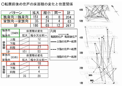 これを調べていくと、あることがわかりました。1階から4階までの家族向けの住戸では、ほぼ全部のベクトルが下から上に行っているわけですね。さらに、独身部である5階6階部分も、ある一定の法則で人が動いていることがわかります。