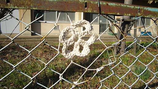 - ロンドンのアーティストは日本の団地で、フェンスのほころびに目をつけ、住民さんたちとで毛糸で花の形を編んでパッチワークをし、共働きで修繕するということをやっていました。