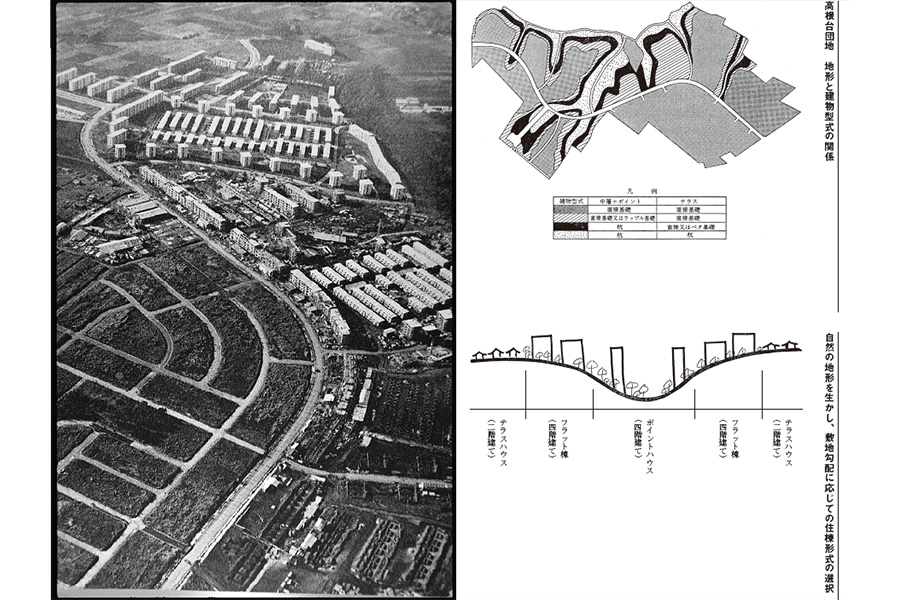 左:高根台団地航空写真 / 右:地形と建物型式の関係