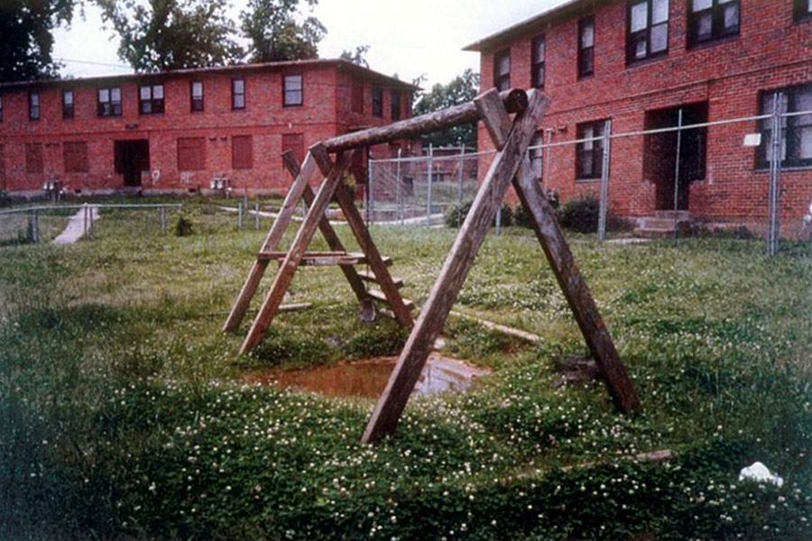- これはワシントンDCの例ですが、僕らは、団地再生工事を行う前と行った後の建物を見比べるという目的で案内してもらいました。屈強な黒人がトランシーバーと拳銃を持って僕らについて歩く。それで「この建物に入りたい」って言ったら、二人がトランシーバーを持って拳銃を構えながら突っ込んでいく。空き家の中では誰が何をしているかわからない。昔はエレベーターホールで麻薬取引が行われていたそうです。見学でこんなことは経験なかったのですが、そんな場所でも屋根をつけて窓を付け替え、設備も整えて生まれ変わりました。受付が中央にあり、もともと住んでいた人たちはそのまま定住し、残りの住戸はより所得の高い人に貸している。このことによって、経営を成り立たせることの助けになっています。