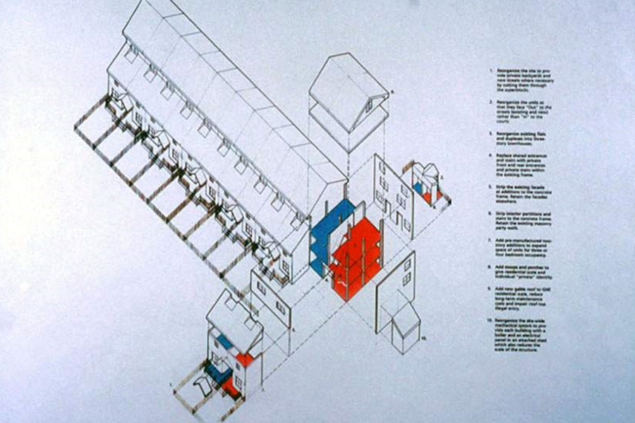 - その他にもいろいろな事例を皆さんに集めていただいたので少しご紹介します。1940年代のフィラデルフィアでつくられた団地の一角ですが、正面から見ると、部分的に3階建ての建物が混じっていて、皆で広場を囲んでいるように配置されて、広場に面してキッチンがあって、建設当時は子どもたちがブランコなどで遊び、その様子をキッチンからお母さんが見守っていました。ところが1990年ぐらいになると、道から奥に入ったところに広場があるので、様々な犯罪が行われる場所になってしまった。これではどんどん人が出て行き、最終的にアバンドンドに近い状態になりそうになった。そこで手を入れてこんな立派な玄関に付け替えて、建て替えずに再生しました。この中がどうなっているかというとこのようになっています。