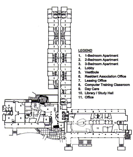 - もともとあった建物の間取り図ですが、住戸が横に並んでいるアパートみたいなところですが、ここを増築して横を大きく広げている。ここには図書館が入っています。所得の高い人が入る集合住宅には、住民のためのライブラリーがあるというのがこのエリアでは普通のことなのですね。それからデイケア。こういった共用施設を導入して付加価値を高めています。住居が綺麗で設備が良いだけでは魅力に欠けるので、こういった工夫をしています。他にも、コンピュータークラスというプログラミング教育のための教室が4つもあります。