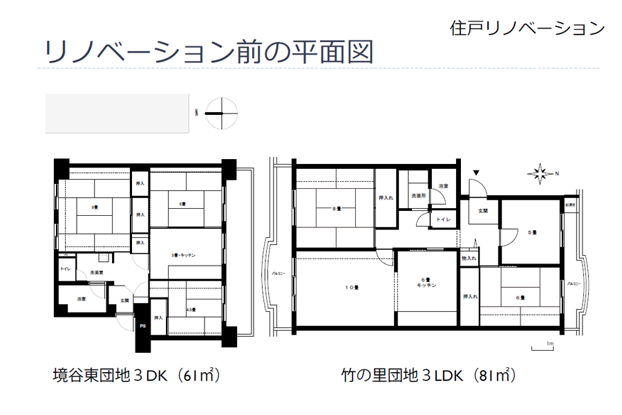 住戸リノベーションのほうの話ですけれども、図面の2団地が対象になりました。左側が「境谷東団地」、右が「竹の里団地」です。境谷東のほうは3DK、そして、竹の里団地のほうは3LDKです。境谷東は3 室とも和室です。竹の里団地のほうは3 室のうち2 室が和室です。やっぱり、和室が多いっていうのも、今の若い世代からすると、ここに入ろうというそういう感じにならないかなぁということで、そういう部分も含めて学生の皆さんに若いセンスで設計してもらいました。