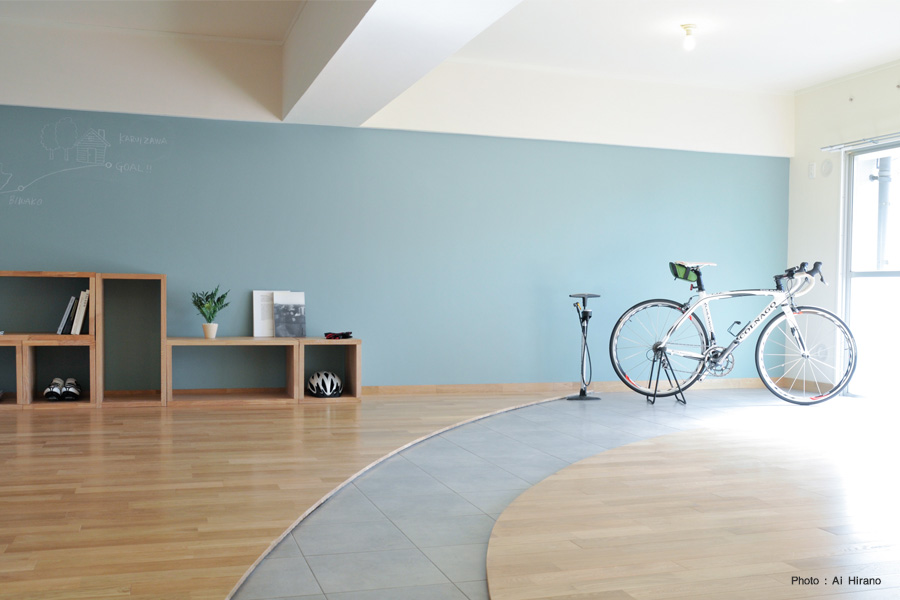 - これは境谷東の住戸ですが、壁を取り払った広い空間の真ん中に曲線の土間が通っています。実は8作品のうち1作品だけは、京都女子大学の学長が選んでいます。この作品はちょっと予算をオーバーしたのですが、学長が「この作品はすごくいい、でもちょっと予算超えてそうだからURが取らないんじゃないか」と言われて学長賞になりました。この写真の自転車は実はURの職員の方の私物ですね。そして、この棚は、ここを設計した学生が手づくりでつくっています。すごくおしゃれに見えますけど手づくり感満載の感じの部屋です。壁はチョークで書けるような黒板仕様になっています。