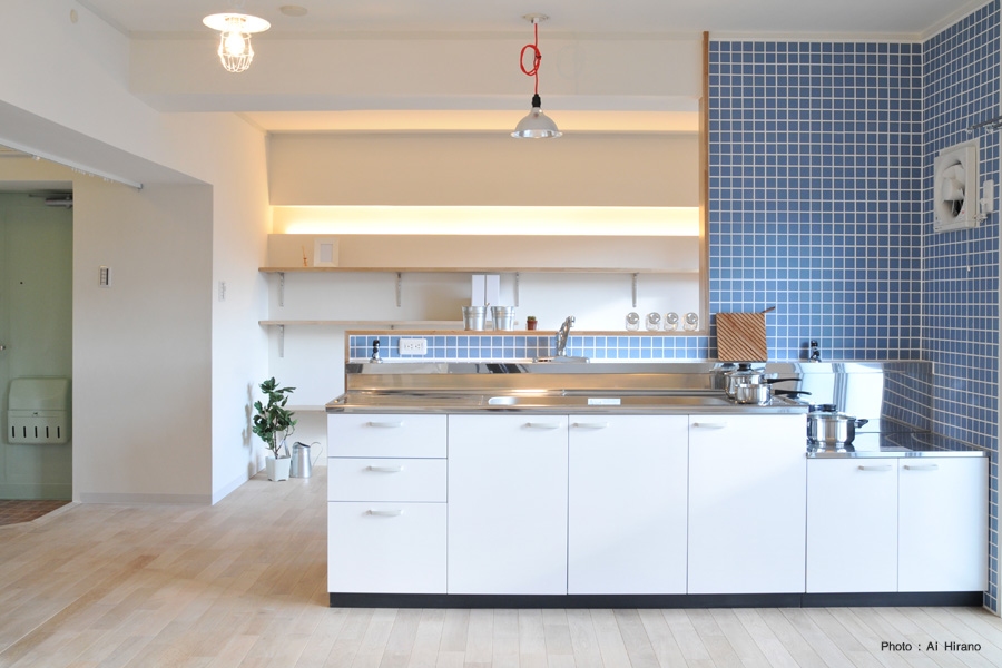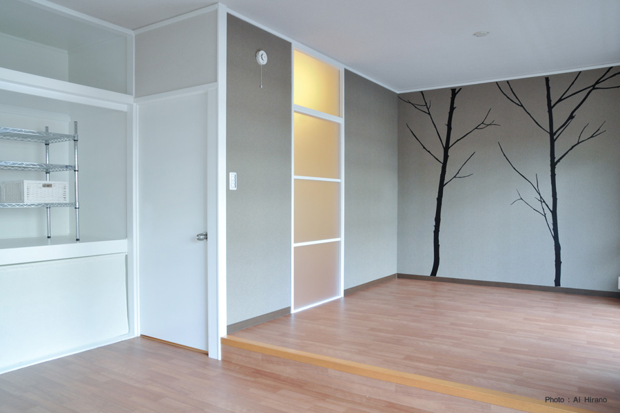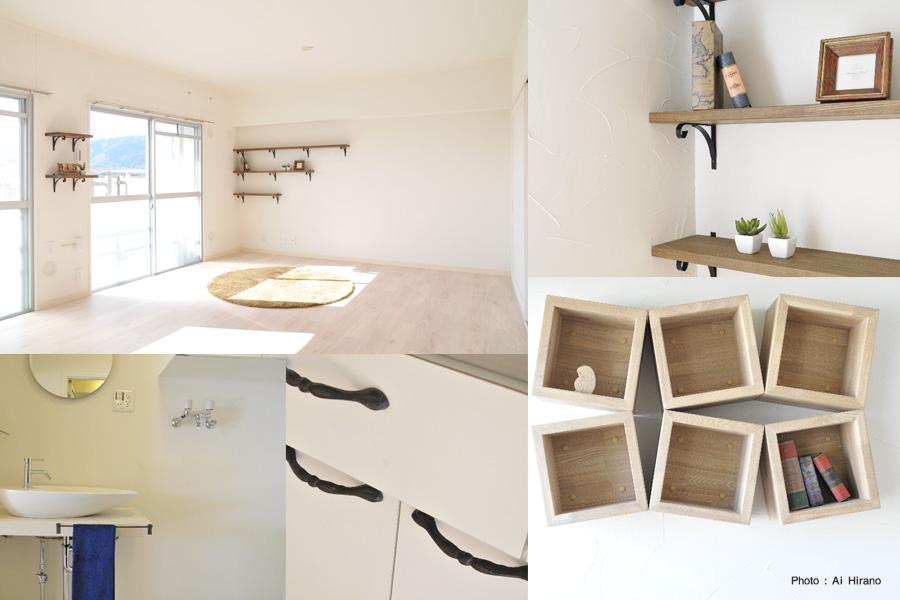 - 次はこれも2回生が設計しましたけれども、間取りを大きく変えたりとかはないんですけども、細かな内装のほうに手間を掛けています。予算としてはURが通常の空き家改修でやっている費用+αぐらいでやるというのが今回の主旨なので、それだと当然キッチン設備を大きく替えるなんてことはできませんので、こういうふうに把手をちょっと替えるとか、そういう形で細かいデザインを積み重ねて、雰囲気のある空間をつくっています。