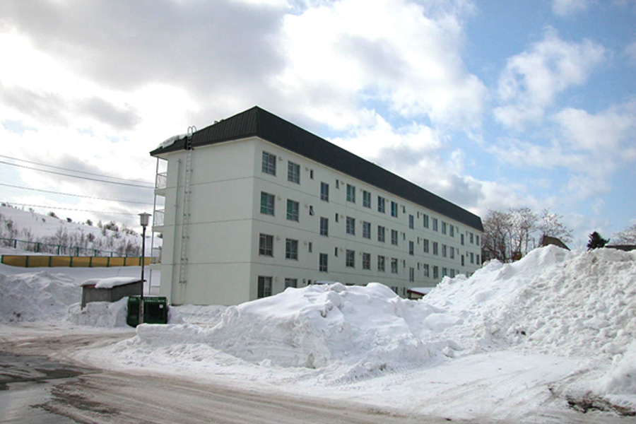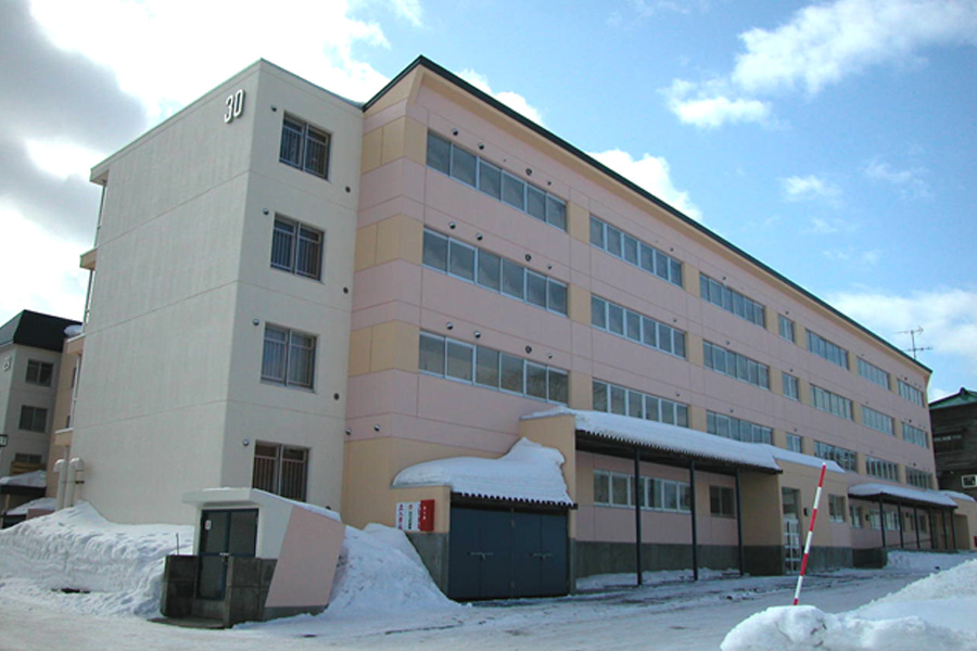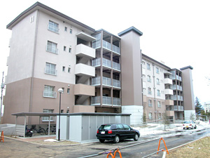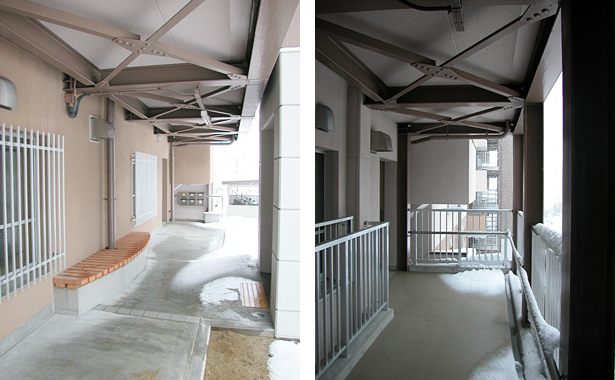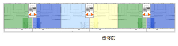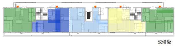 この事例では、階段を1つ取ってしまい、そこをエレベーターのシャフトとして利用しています。廊下も増築していますので、玄関の位置を変える必要が生じ、構造体にも手を加えています。どうせならばと、住宅どうしを区切るコンクリートの壁にも手を加え、1階につき6戸だった住宅の数を5戸にして、住宅を広くしています。