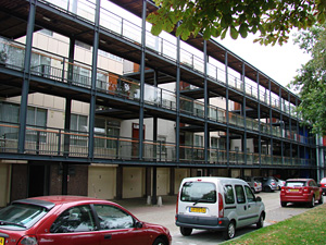 まず、オランダの団地です。つくり方は少し違いますが、考え方は日本と似ています。これももともとは階段室型の住棟でしたが、日本と同じくアクセスが問題になったので、共用廊下とガラス張りのエレベーターが増築されています。エレベーターがガラス張りなのは、死角をなくし、犯罪が起こりにくいようにするためです。