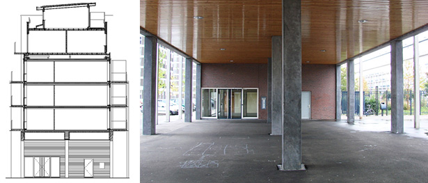 そこで、1・2階部分を抜いて大きなゲートにして、団地に裏と表をつくらないようにしています。ゲートにした部分には、後から柱を建てて補強しています。さらにバルコニーを増築し、また上には木造の軽い住宅を載せています。エレベーターも新しく増築されたので、地面と近い下の階には子育てをする家族が住まい、上の階には高齢者が住んでいます。