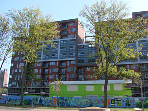 - こちらもレンガ造の5階建ての集合住宅に対して、2階分を増築した事例です。増築された住宅は、一つ一つがコンテナ式になっていて、工場でつくった物を載せていっています。増築した住宅へのアクセスは、隣に高層の集合住宅を建てて、そこから新しい住宅まで行けるようにしています。そうすると、高層棟のエレベーターを使って、古い団地の増築部分にも人が出入りすることができるようになります。