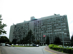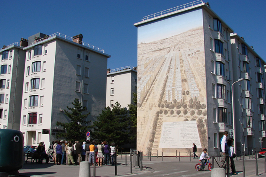 - 次の団地はリヨンのものですが、これも日本の団地のモデルになったものです。都市で工業がどんどん盛んになっていくと、工業で都心は汚れますから、人が住まうエリアは郊外につくりたい。そして、集合住宅は団地という形式がふさわしい。そういうことを、トニー・ガルニエという建築家が考え、この概念を具現化したものを「工業都市」と名付けました。しかし、今の都市では、主要な産業は工業から知的産業へと転換し、都心もきれいになっています。であるならば、都心に人が住む場所があっても良い。これが都心回帰という減少ですね。 一方、郊外はただ住まいだけのエリアではなく、働く場や知的な刺激を得る場所があって良い。そういうわけで、団地がSOHOにリノベーションされたりしているわけです。このガルニエの「工業都市」も、そうした流れの中にあって、なんと団地自体が美術館へと改修されています。この団地には、今でも人が住んでいるのですが、この歴史的な団地を見学し、さらに団地の妻壁にアーティストが絵を描いて、それをガイド付きで見て回る、ということが行われているのです。トニー・ガルニエによる「工業都市」のドローイングも、団地の妻壁に転写されて、多くの人々が眺めていました。