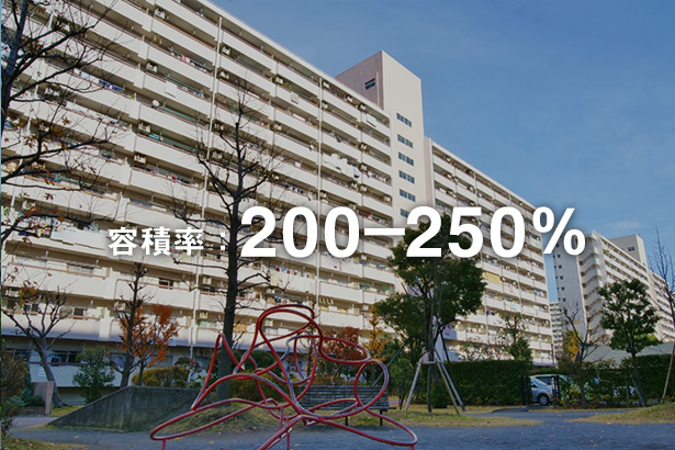 しかし、技術の進化はとどまることを知らず、70年以降は集合住宅が高層化していきます。大きな要因はコンクリートをつくる技術が向上したことですが、エレベーターも発達し、高層団地が一般的になっていく。容積率は200~250%に跳ね上がります。
