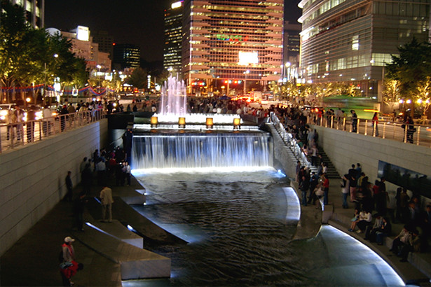 - 韓国では、高速道路がかかっていた川から高速道路を撤去して、親水公園に変えた「チョンゲチョン」という川があります。