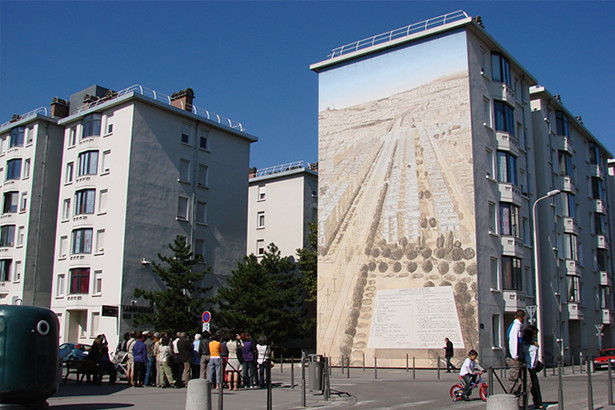 - 「工業都市」は、重工業の時代の住宅像を追求したもので、日本の団地のモデルになりました。トニー・ガルニエという建築家が構想したものですが、最初はアイデアにとどまっており、ドローイングが描かれたのみでした。その後、この構想が認められ、実現したのがこの団地ですが、壁面にはガルニエのドローイングが転写されています。なぜかというと、この団地はいまでは美術館としても使われているんですね。現在も住まわれている団地の壁面にアーティストの作品などを転写し、休日になるとたくさんの人が絵を見に訪れます。つまりここでは、団地の用途と美術館の用途が重なっているというわけです。