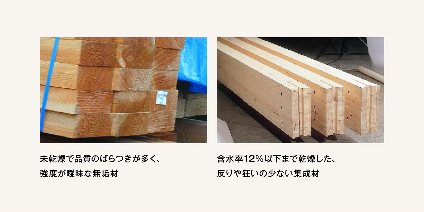 採用している集成材の強度は、通常の住宅で使用する無垢材の1.6倍。一つひとつ品質試験を実施し、強度に加えて、木材の反りや変形にも強い素材を厳選しています。