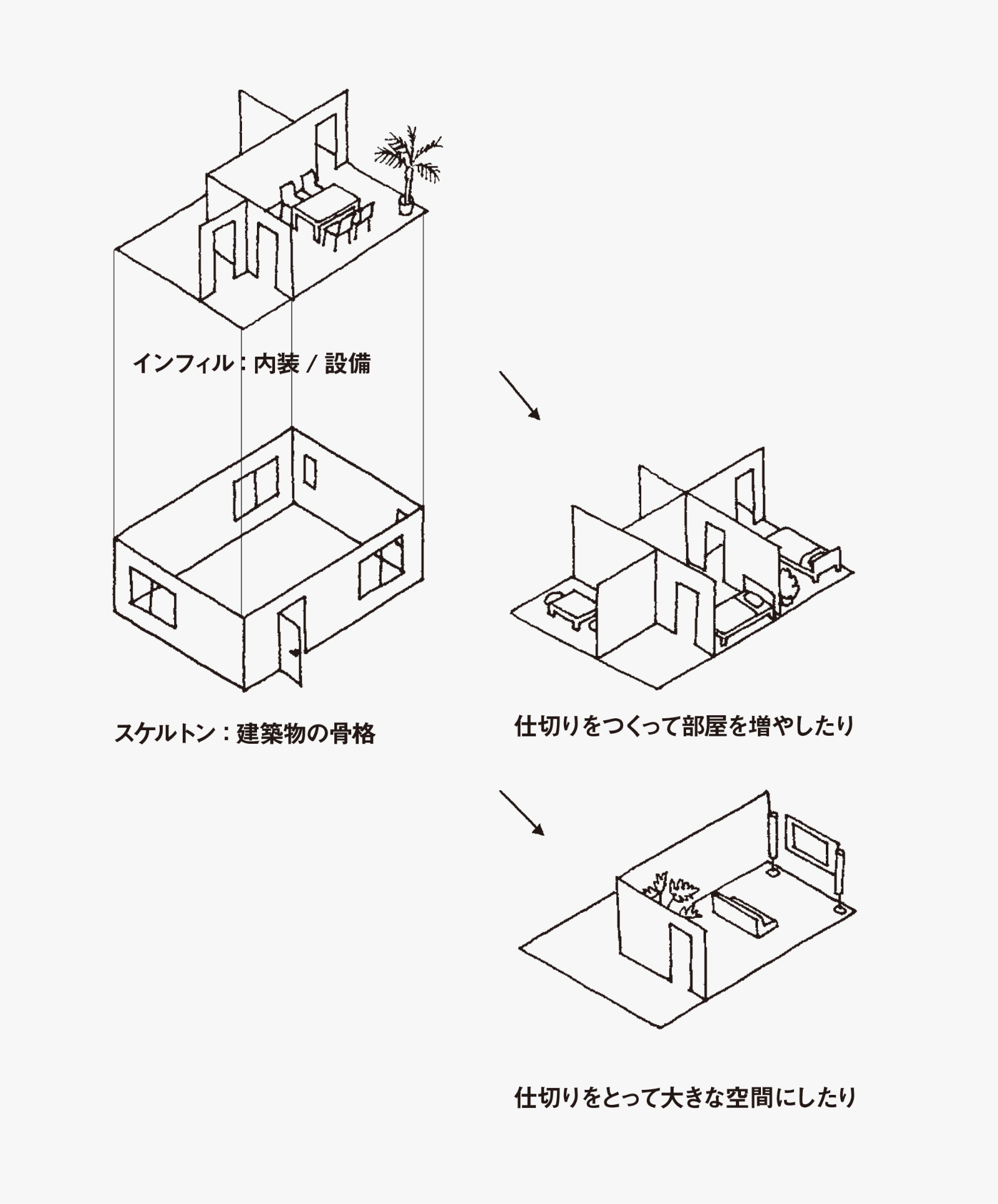 これはあくまでも一つの例ですが、これまでの家はこのような家族構成の変化に対応することができませんでした。そのため、たくさんのお金をかけて大規模な工事をしたり、まだ使える家が取り壊されたりしていたのです。それは、一般的な家では一度決めた間取りを簡単に変更できず、部屋ごとの収納の量も決まっていることが多かったから。