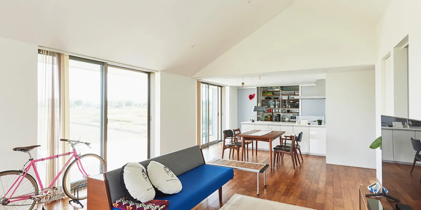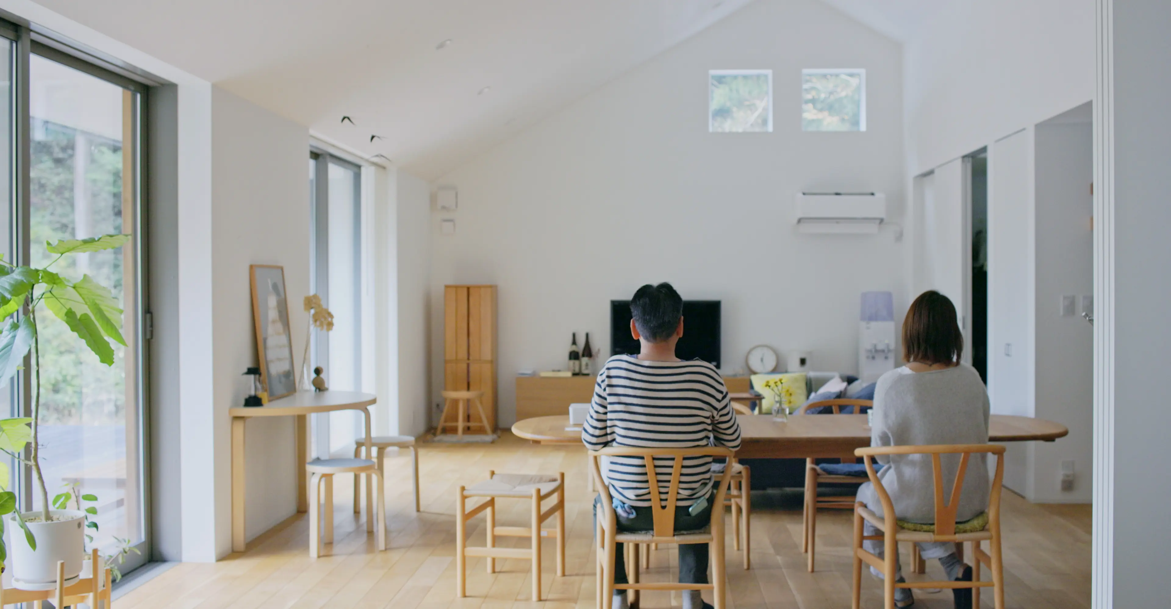 お子さまが家を出てから、ご主人が元々生まれ育った実家の跡地に「陽の家」を建てたお二人。自然豊かな環境ですが、最新の家電を取り入れて快適に過ごすことができているそう。「陽の家」の特長とも言えるゆるく仕切られた一室空間で、長年連れ添ったおお二人が程よい距離感でそれぞれの時間を過ごす様子は、まさに理想の大人の平屋暮らしです。
