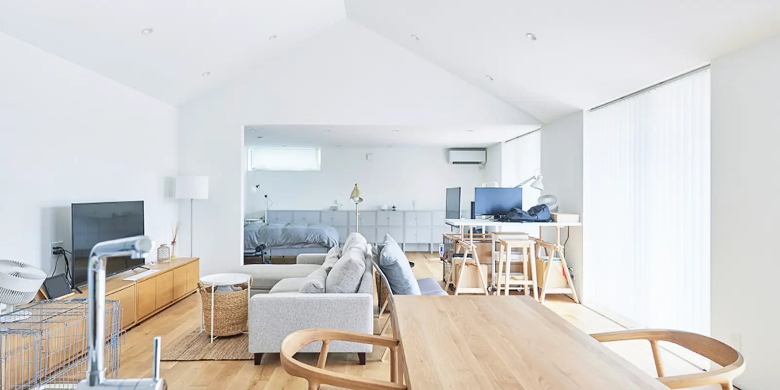 青森県十和田市にある「陽の家」T邸は、余計な物が何もないシンプルさと様式美を兼ね備えたお宅です。平屋であることと部屋と部屋の間の間仕切りがないことからロボット掃除機も使いやすく、家事が苦手だというご主人も快適。また愛犬は室内で飼っており、居心地のいい空間の中で飼い主と一緒にのびのび過ごしているそうです。