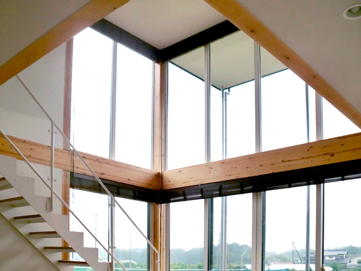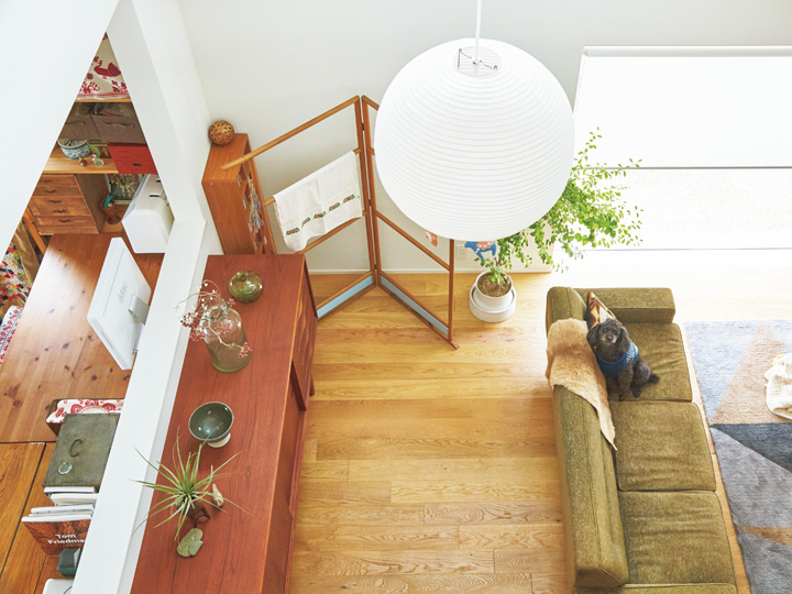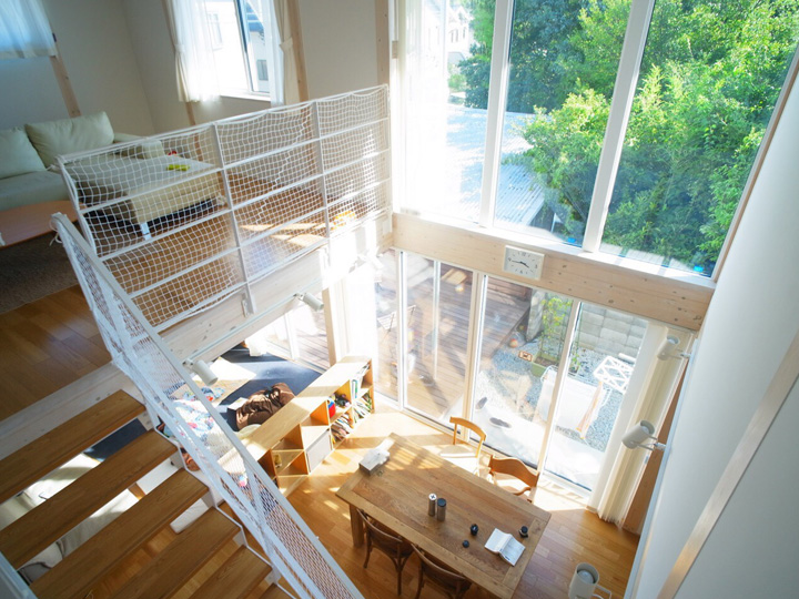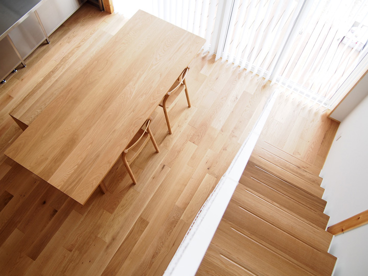 はじめ、こんな開放的な家での暮らしは難しいと思いました。どんな人が建てるんだろうと。でも実際に木の質感を見て一目ですべてを気に入ってしまった。「趣味は掃除機」というほど整頓好きの妻も大賛成。家を建てるのは先のことだと思っていたのに半年後に衝動買いです。心地よい風が通り抜ける、吹抜けの二階を将来どうするかはまだ決めていません。「木の家」ならどのようにでもなると思っているので。── ご入居者より