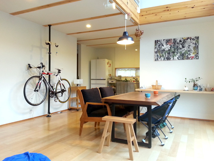 個性と言えるかどうか分かりませんが、昔から人と違うものが好きだったかもしれません。クルマもあえてイタリア車とフランス車を乗り継いできたし。妻の趣味は手工芸の日用品集め、私は自転車とバイク。二人の好きな世界をそのまま家に引き継ぎたくて、余計な味付けがない無印良品の家を選びました。でも外壁だけは黒にしたんです。黒い家を入ると白い世界が広がっているって意外性がいいでしょう。── ご入居者より