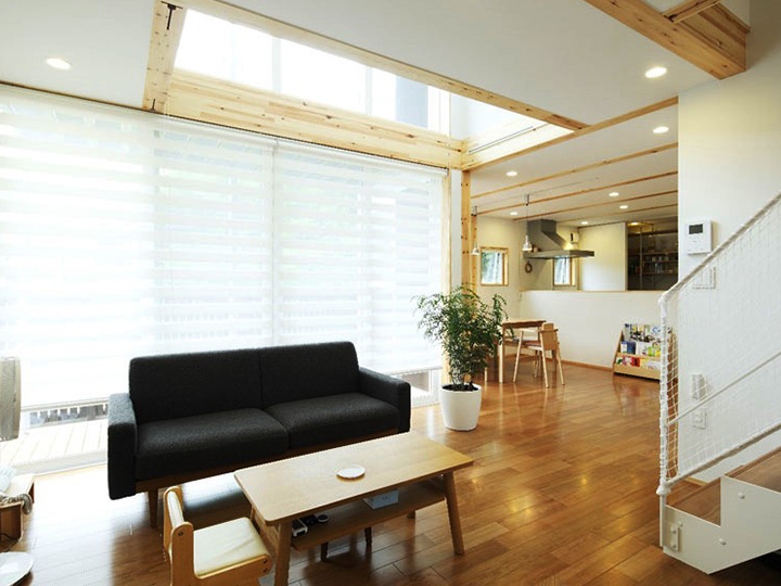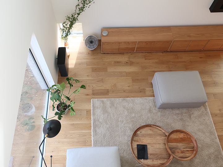 玄関扉を開けると、玄関スペースも廊下もなく、そのまま生活の中心となるリビングへ。建具で自由に空間を仕切り、家具のレイアウトによって多目的に使える、昔ながらある日本家屋のような可変性を持ち、融通が利く暮らしを目指しました。家にある物の大きさや量、子供の生活も、時間を経て変化していきます。家を建てる時、「今」だけでなく、家族の「将来」を見越して、選択肢を狭めず、足し算や引き算ができる家を考えました。── ご入居者より