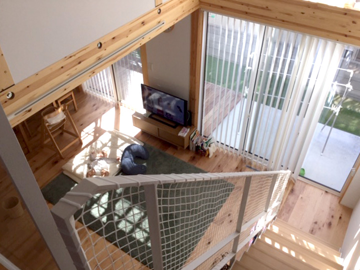 子どものころ、畳縁や敷居のラインに見えない仕切りがあるように感じていました。我が家も吹き抜けに架けた梁によって、ダイニングとリビングを分けています。部屋を壁で仕切ることは簡単ですが、「間」で仕切ることで、空間同士に豊かな関係が生まれます。玄関を開けると、ダイニングの先にリビング、その奥の大開口から広がる風景。私たちの「木の家」は、間で仕切りつつも空間が連続する、日本の住まいならでの特長を継承しているのです。── ご入居者より