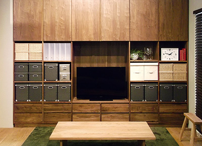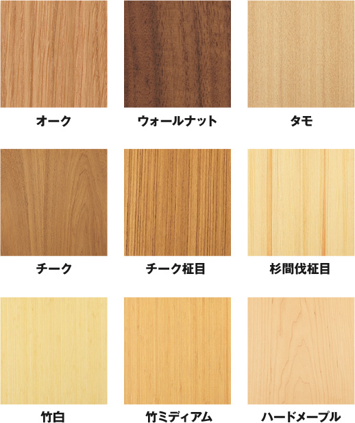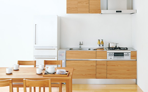 無印良品の収納家具と同じ、オーク材、ウォールナット材のシステムキッチンです。グレー色もお選びいただけます。