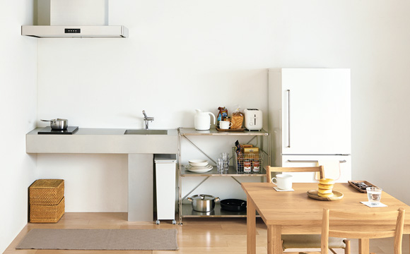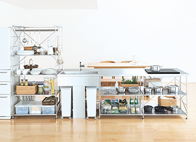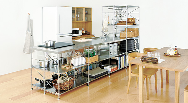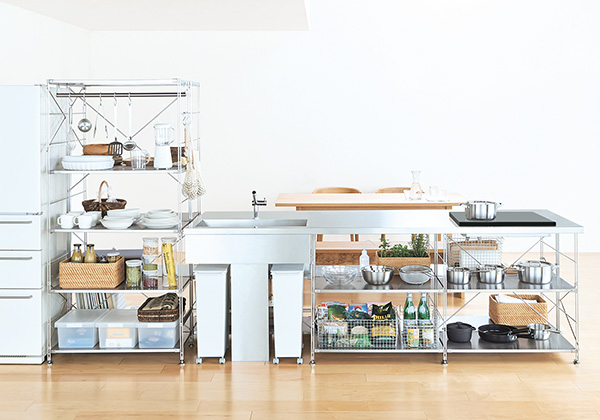 ステンレスユニットシェルフの機能性と収納力はそのままに、キッチンをつくりました。