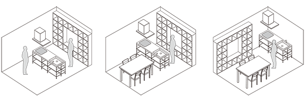ユニットシェルフの奥行きにサイズを合わせた、壁面の収納と一体化する、コンパクトなキッチンです。