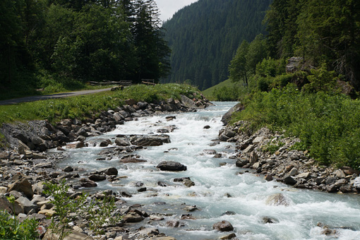 森のトンネルの隣には雪解け水が轟々と流れる川があり、