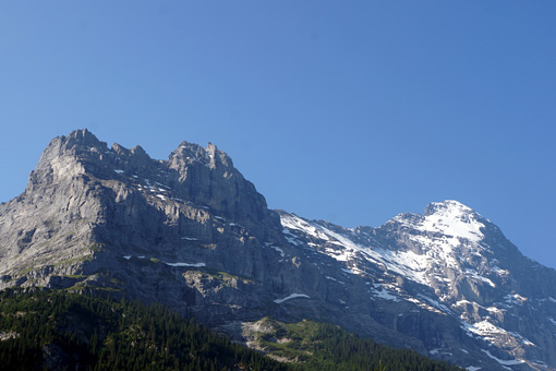 キャンプサイトから眺める氷河が削った凛としたシルエットの山の岩肌は