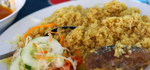 食事ではピラフの発音が訛ったピラウという米料理がポピュラーで、