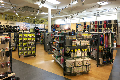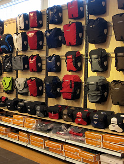 店内を埋め尽くすのは自転車のウェアや、ヘルメットを始めとした