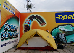 日が暮れるギリギリに現れたガソリンスタンドに飛び込み、テント張る許可を貰い、