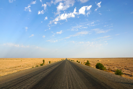 永遠に変わらぬ景色は、ただひたすら広大で平坦な砂漠に一本道を延ばすだけで、