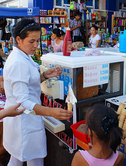 バザール内には、味付きのガスウォーター屋さんやアイスクリーム売りもいて、