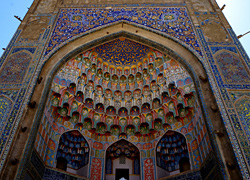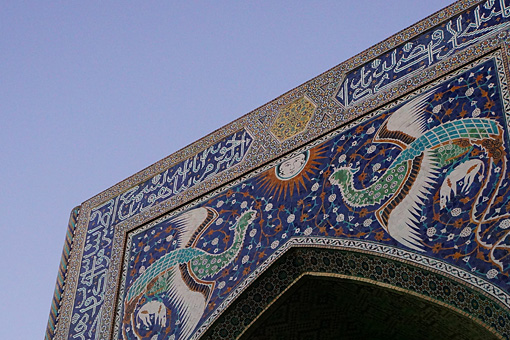 池のほとりに建つマドラサ(神学校)の入り口には、