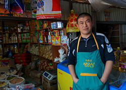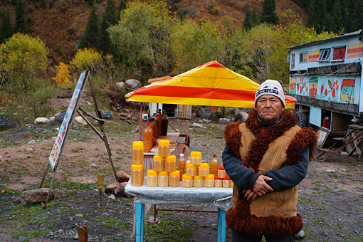 その軒先でクムスという馬乳の発酵酒を売るキルギス人に出会えます。