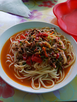 中国系ムスリムであるドゥンガン族の料理を出すお店のラグマンは